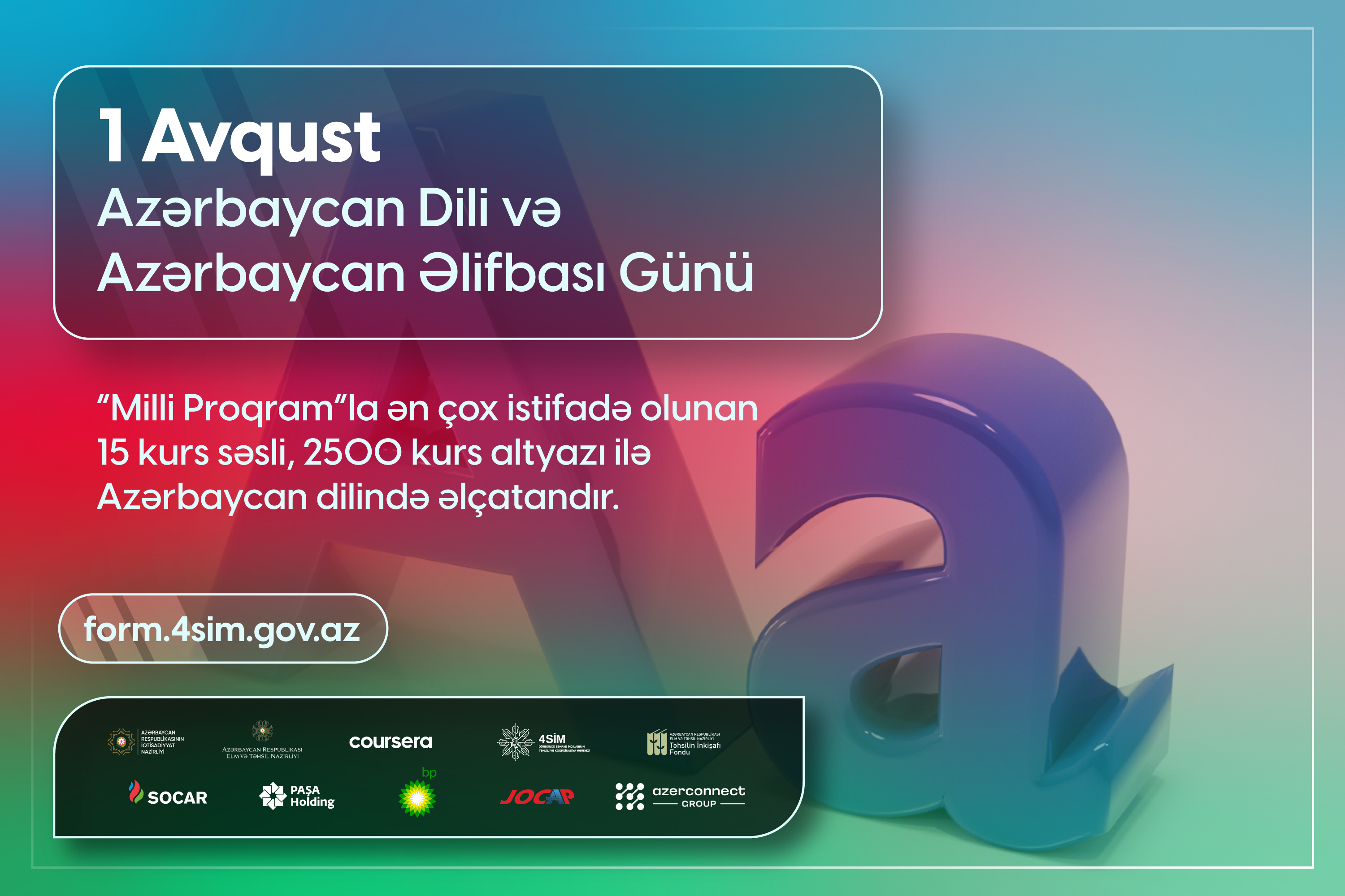 1 Avqust - Azərbaycan Əlifbası və Azərbaycan Dili Günü münasibəti ilə “4Sİ Akademiyası” çərçivəsində rəqəmsal texnologiyalar sahəsində ana dilində biliklərə çıxış imkanlarının genişləndirilməsi üçün bir neçə kurs dilimizə dublyaj olunub.